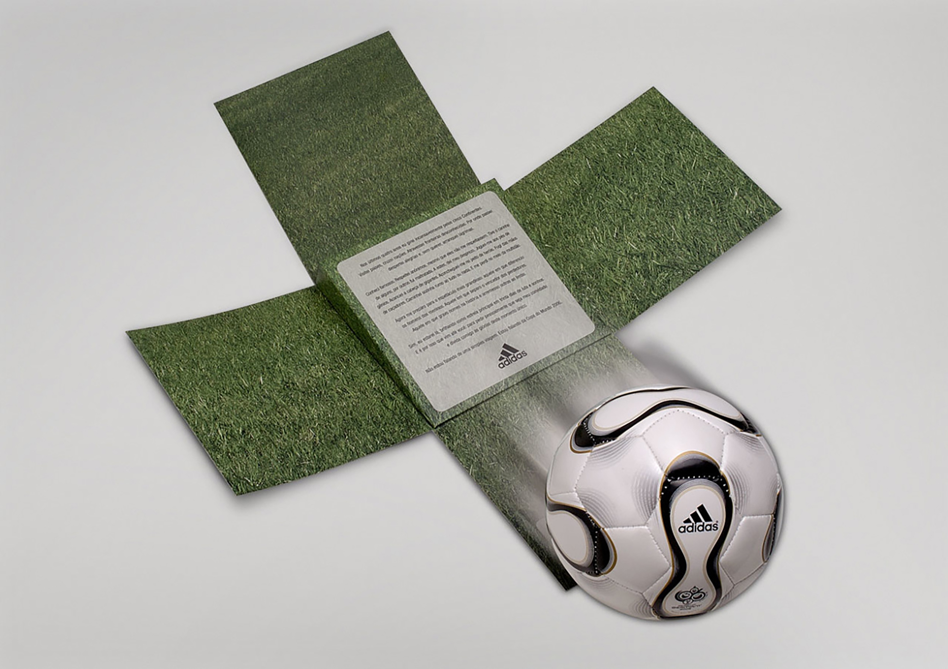 A caixa convite com mini bola dentro foi usada para convidar clientes e fornecedores selecionados a assistir a copa do mundo com a Adidas.